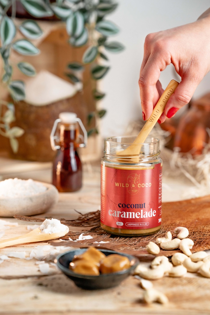 Caramelartiger Kokosaufstrich. Das süßeste all unserer Produkte. Am besten mit Nussmus aufs Brot, zu Pancakes, mit Porridge oder Granola oder in Rohkostgebäcken und Nachtischen als Karamell-Alternative.