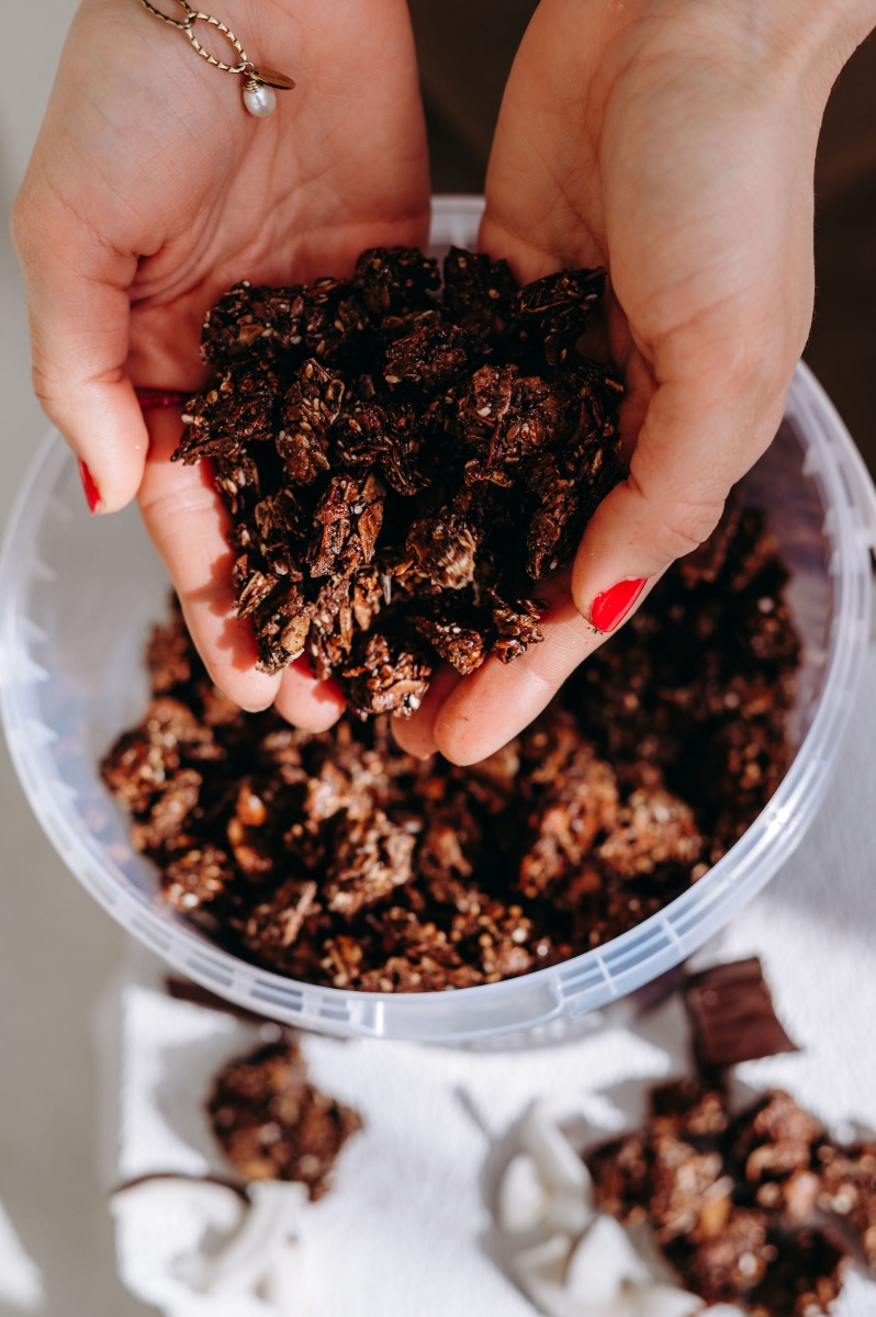 Veganes Granola mit sehr geringem Glutengehalt bietet viel mehr als nur das betörende Aroma von Kakao: Es ist ein köstliches Gericht voller Nährstoffe!