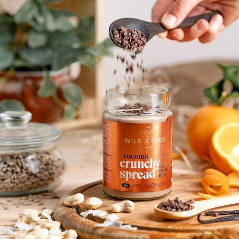 Diesen cremigen Aufstrich mit knusprigen Kakaonibs stellen wir mit Liebe aus fein gemahlenem Kokos, Cashew- und Sonnenblumenkernen her. Diese Grundzutaten süßen wir mit ein wenig Kokoszucker und mischen ihnen zerstoßene Kakaonibs bei, die den Aufstrich zu einem einzigartig knusprigen Erlebnis machen. Den krönenden Abschluss bilden Vanille und Orange, die im Aufstrich für den ausgewogenen und unwiderstehlichen Geschmack sorgen.