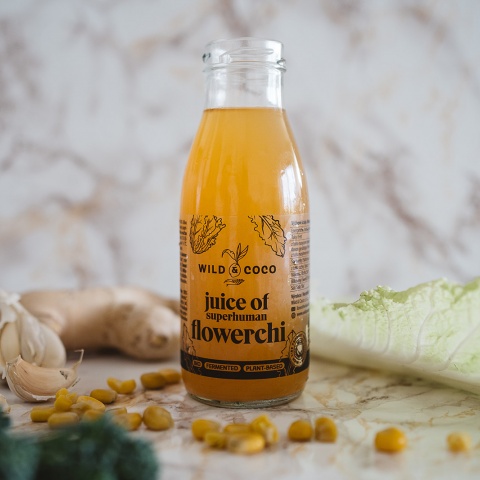 Fermentovaná a super-živá šťáva z našeho jemného Superhuman Flowerchi. Voní a chutná jemně po kari. Jedna lahvička obsahuje hotový večírek pro přátelské bakterie, které se těší do vašich salátových dresinků či polévek.