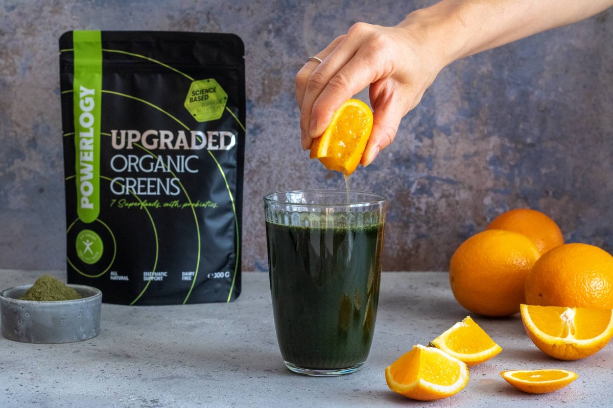 Zelená listová zelenina, která je součástí tohoto mixu, je bohatá na bioaktivní látky, jako je lutein, který přispívá ke snížení rizika kardiovaskulárních onemocnění a zpomaluje úpadek kognitivních funkcí způsobený stárnutím. Tento nápoj s příjemnou pomerančovou příchutí vám dodá energii a podpoří trávení.