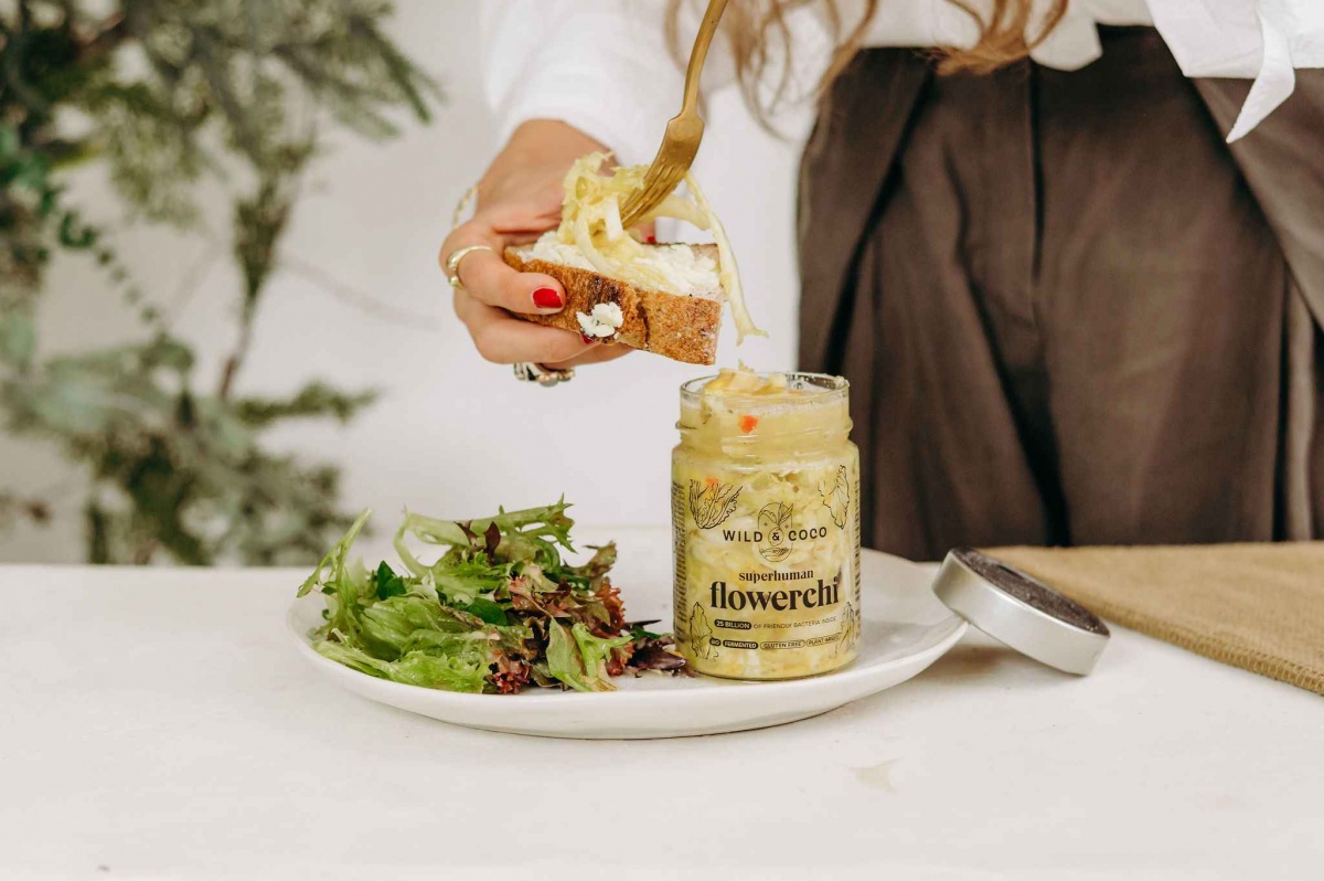 Pestrobarevná variace kimchi z čistě rostlinných ingrediencí má bohatou osvěžující chuť a překypuje životem. Flowerchi je totiž díky fermentaci plné blahodárných probiotik Superhuman.