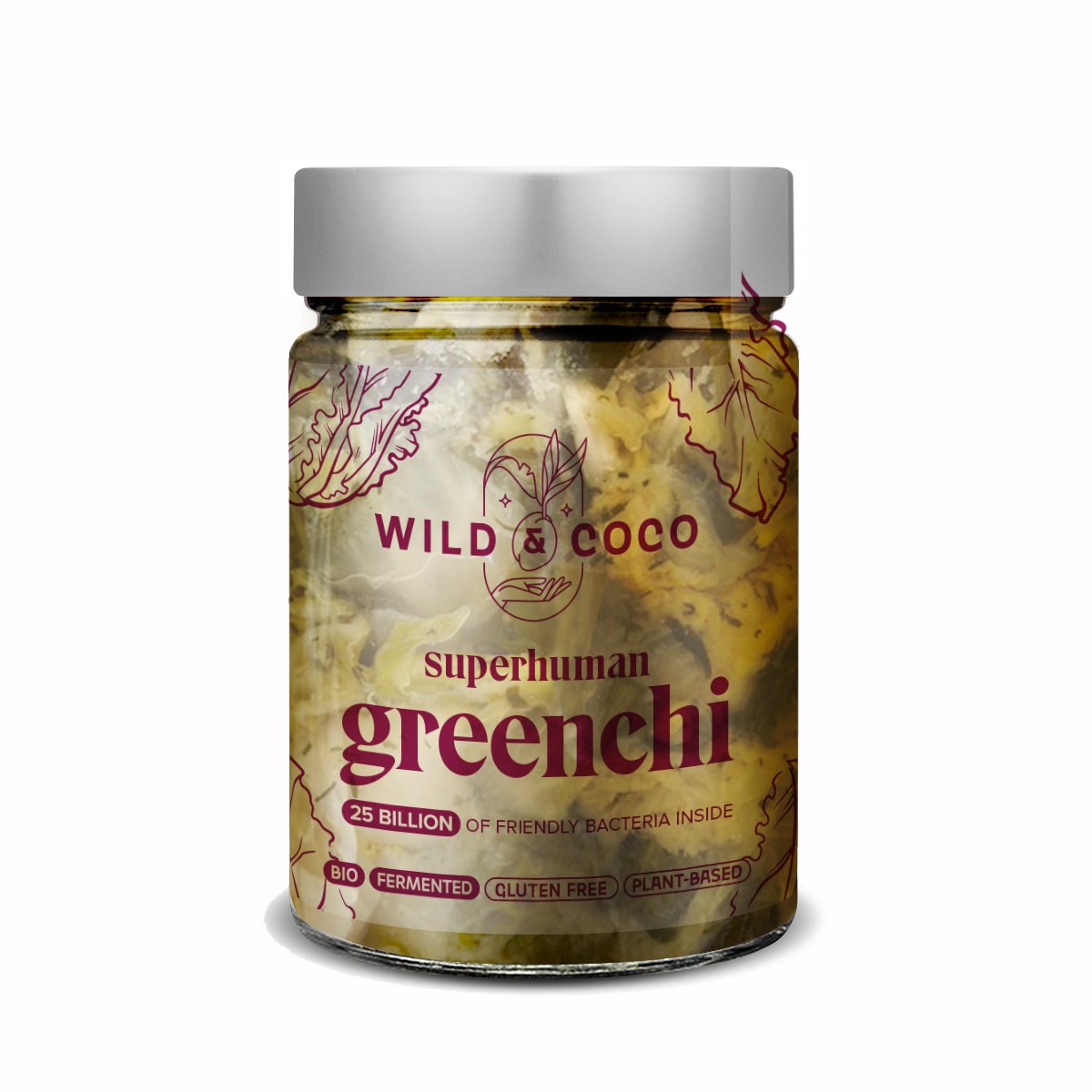 Naše speciální variace kimchi v zelených barvách. Čistě rostlinné, plné svěží chuti a blahodárných probiotik Superhuman. Greenchi vyrábíme podle vlastního receptu.