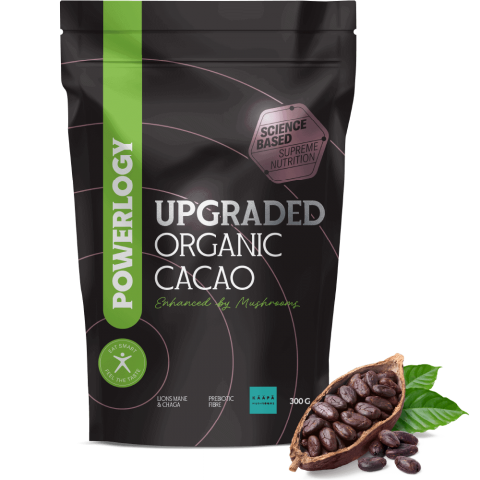 Powerlogy Upgraded Organic Cacao je mnohem víc než jen kakao. Díky theobrominu poskytuje přirozenou energii bez vedlejších účinků kofeinu, zatímco houby Chaga a Lion’s Mane stimulují nervovou soustavu a podporují duševní výkon. Čekanková vláknina navíc zlepšuje zdraví střev a posiluje mikrobiom.