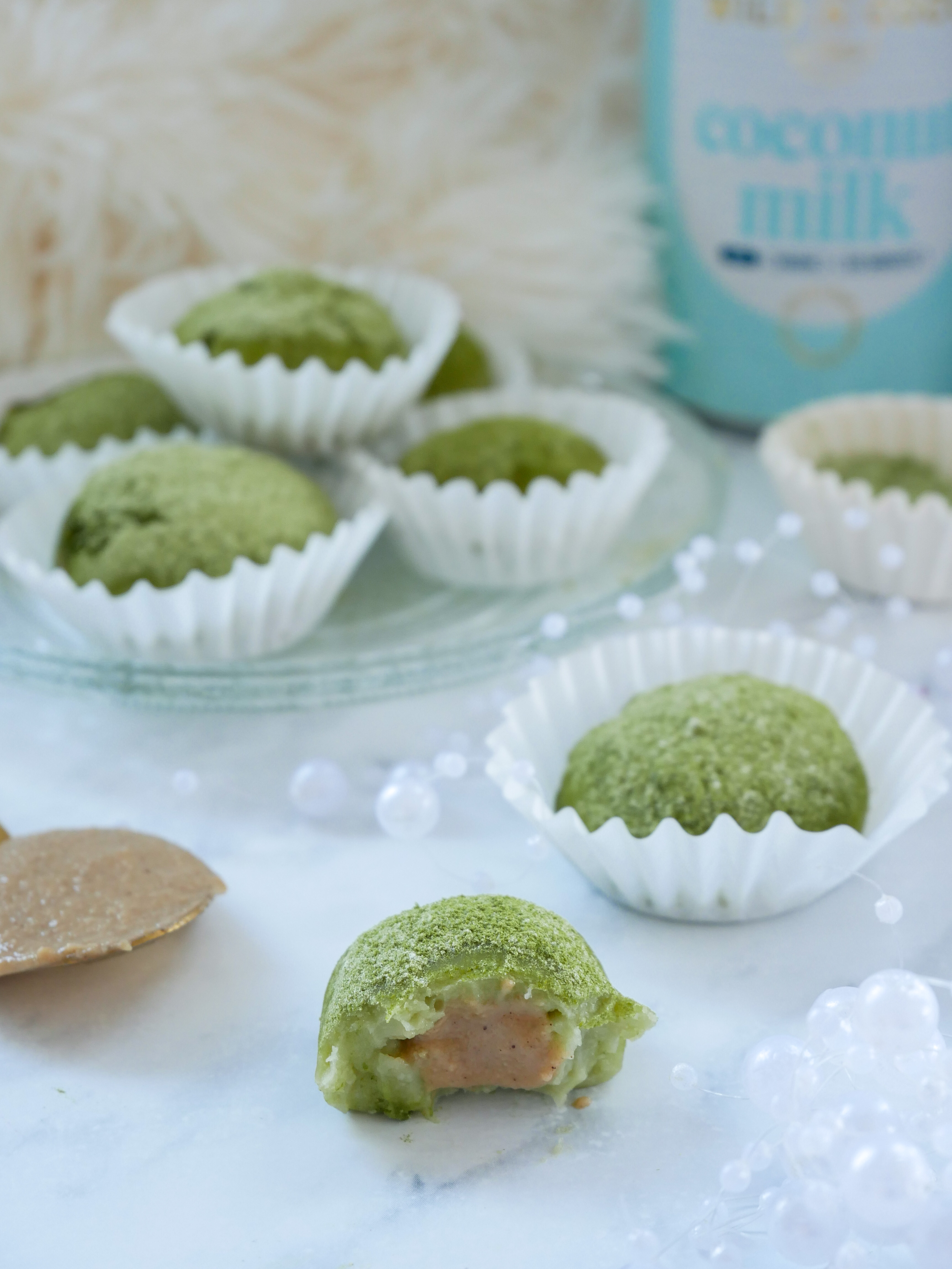 Z těsta vytvořte kuličky. Každou kuličku vyválejte, doprostřed dejte lžičku mandlového másla a zalepte. Mochi ještě lehce posypte práškem matcha tea smíchaným s moučkovým březovým cukrem.