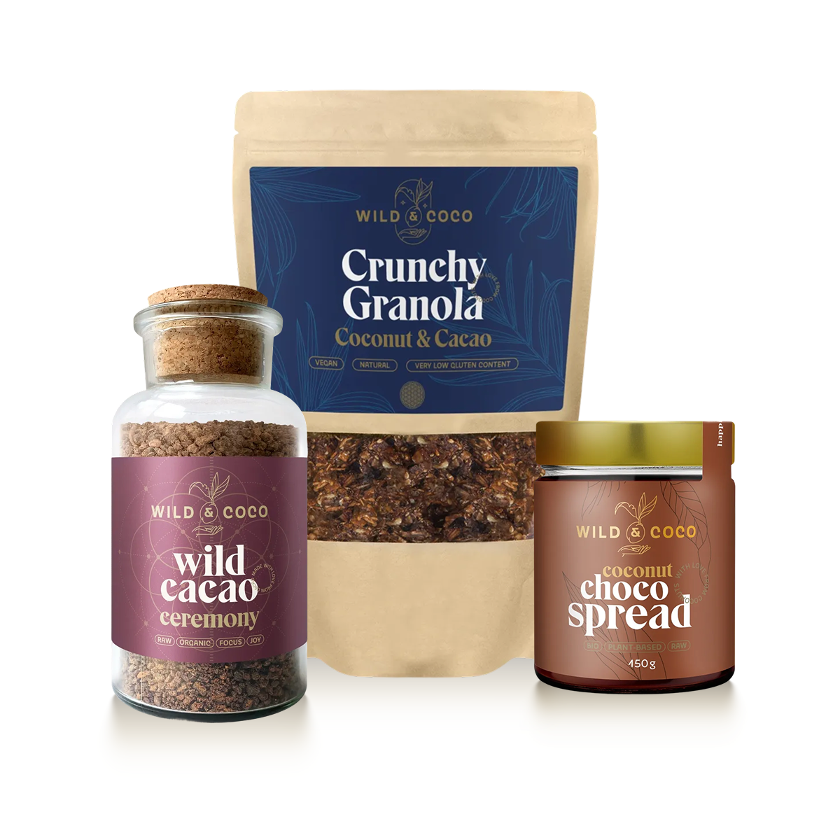 Vnútri nájdete: ceremoniálne kakao 190 g, kakaovú granolu 250 g a kakaový spread 150 g. Pre chvíle, kedy chcete niečo sladké a zároveň dôstojné: na raňajky, k popoludňajšej pauze aj večernému upokojeniu.
