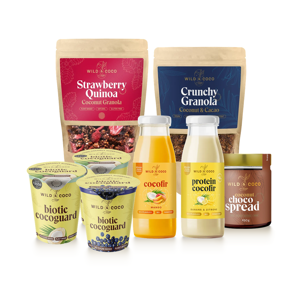Vnútri nájdete: Cocofír mango, 2× veľký biely Cocoguard, čučoriedkový Cocoguard, Banana Protein Kefír, granolu čoko + granolu jahoda a Choco Spread 150 g. Pre hektické rána, keď nechcete nič vymýšľať, ale chcete sa najesť tak, aby neprišiel rýchly prepad.
