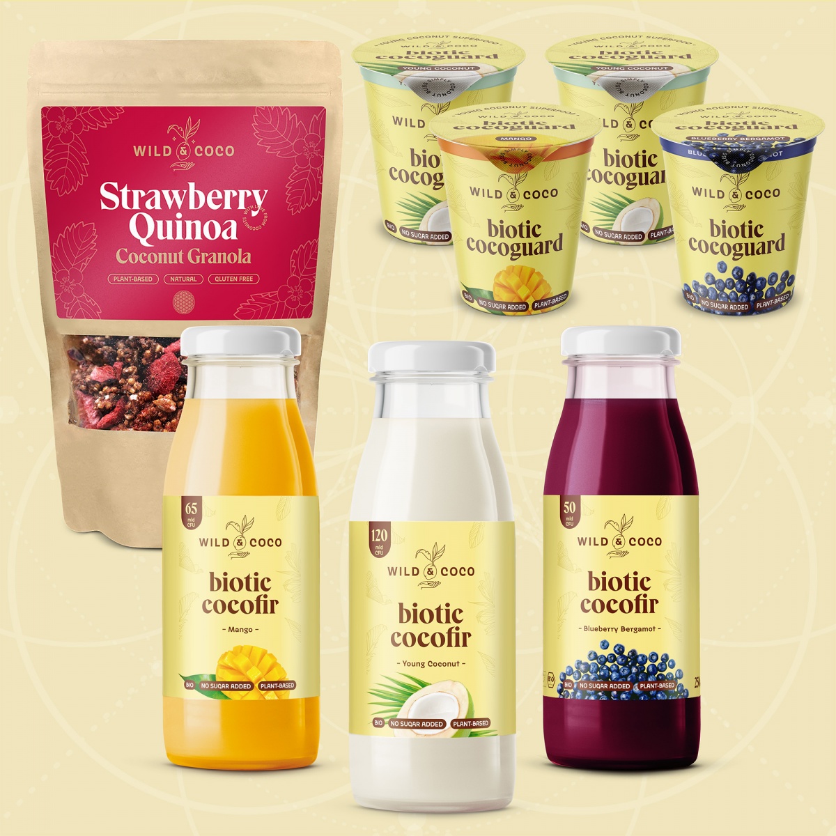 Pretože sa teším na raňajky od WILD & COCO! V tomto balíčku na vás čaká náš obľúbený rad Biotic s fermentovanými produktami z mladého kokosu v 3 lahodných príchutiach. Pridali sme našu obľúbenú Strawberry Quiunoa Coconut Granolu, ktorá neobsahuje lepok ani rafinovaný cukor a skvele funguje s probiotickým základom Cocofir alebo Cocoguard.