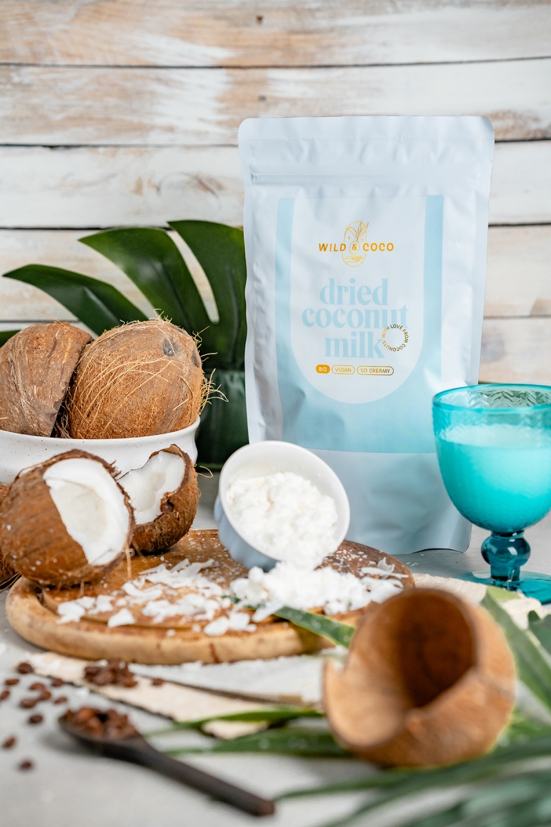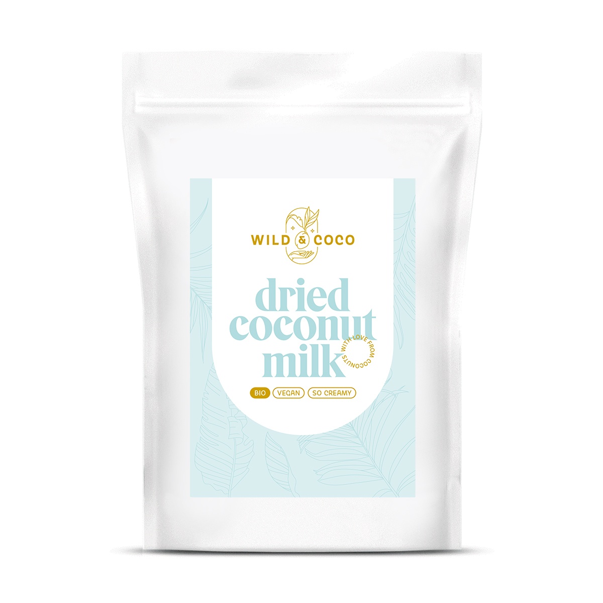 Sušené kokosové mlieko v prášku s mnohými spôsobmi použitia. Takzvané "šťastie v prášku", ako ho nazývame u nás vo Wild & Coco. Má lahodnú a plnú kokosovú chuť a vôňu. Je skvelou náhradou živočíšneho mlieka a smotany, pretože prirodzene neobsahuje laktózu. Sušené kokosové mlieko vzniká zmiešaním a dehydratáciou kokosovej dužiny a jeho výhodou je dlhšia trvanlivosť a jednoduchšie skladovanie ako v prípade tekutého mlieka. Je preto skvelým doplnkom každej kuchyne - veľkej, malej alebo tej, do ktorej nechodíte tak často.