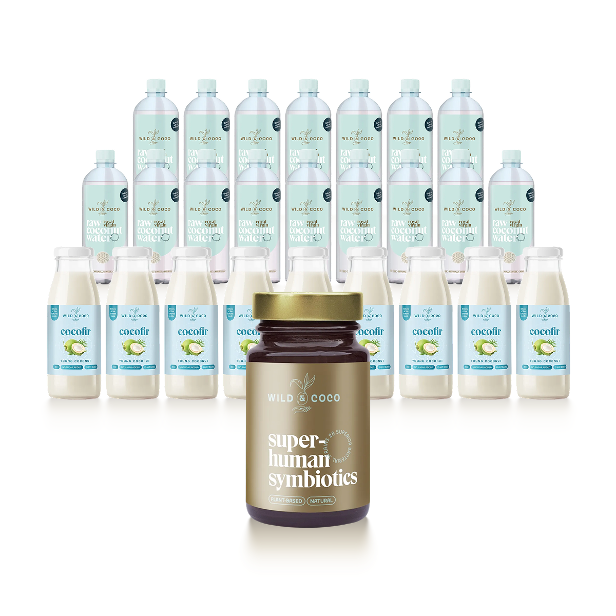 Vnútri nájdete: 16× Royal Virgin kokosová voda, 9× Biotic kefír a Superhuman Symbiotics (10 kapsúl). Pre týždne, keď sa chcete oprieť o jasnú štruktúru a nepridávať si rozhodovanie navyše.
