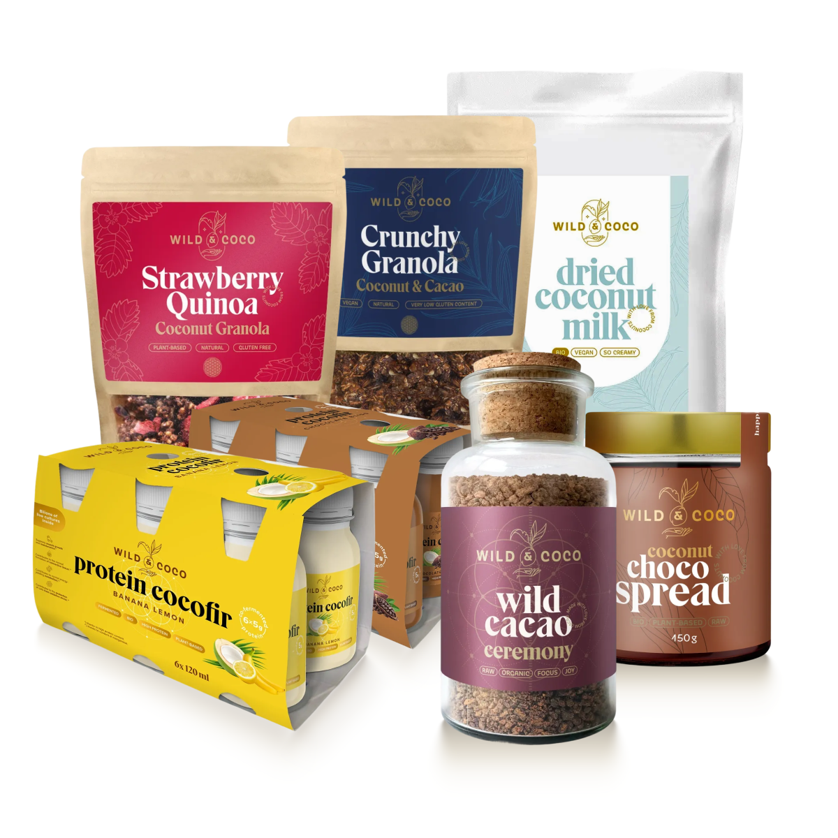Vnútri nájdete: 1× 6 ks čoko proteín shot, 1× 6 ks banana proteín shot, granolu čoko + granolu jahoda, čokospread, sušené kokosové mlieko a ceremoniálne kakao. Pre chvíle chutí na sladké, pre deti aj dospelých, keď chcete maškrtiť rozumne a bez následnej únavy.