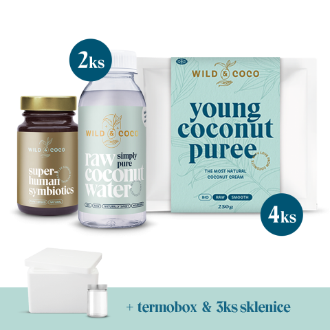 V rozmixované kokosové dužině s kokosovou vodou se skvěle množí bakterie. Proto je dobré přidat tam co nejvíce těch přátelských. My vám dodáme 10 kapslí Superhuman Symbiotics.