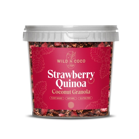 Křupavá granola s lyofilizovanými jahodami je bezlepková veganská pochoutka pro všechny, kdo rádi snídají či mlsají zdravě. Je totiž plná semínek, pufované quinoy a samozřejmě kokosových chipsů. Agáve sirup a rozemletá lněná semínka drží vše pevně pohromadě, takže ji klidně můžete vzít s sebou na výlet či do práce a ujídat jen tak. Výborně se hodí taky na snídani ke cocoguardu.