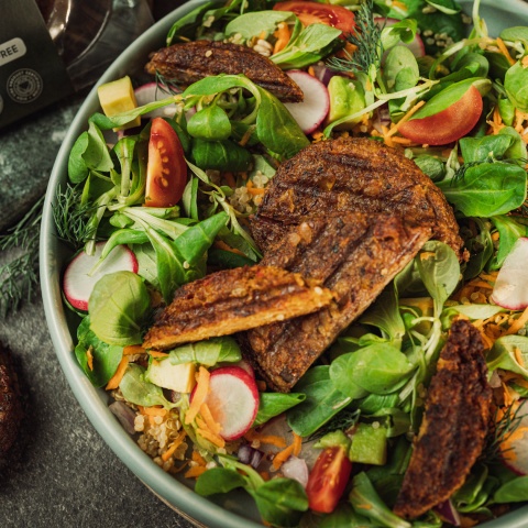 Housku k němu ani nebudete potřebovat! Díky vyváženému složení můžete burger jíst klidně samotný, s čerstvou, fermentovanou nebo pečenou zeleninou. Je vyrobený z citlivě a nápaditě ochucené zeleniny, která do syta nakrmí vaše střevní mikroby. Bílkoviny získáte z černé fazole, sacharidy z vloček a hnědé rýže, tuky pak z řepkového oleje.