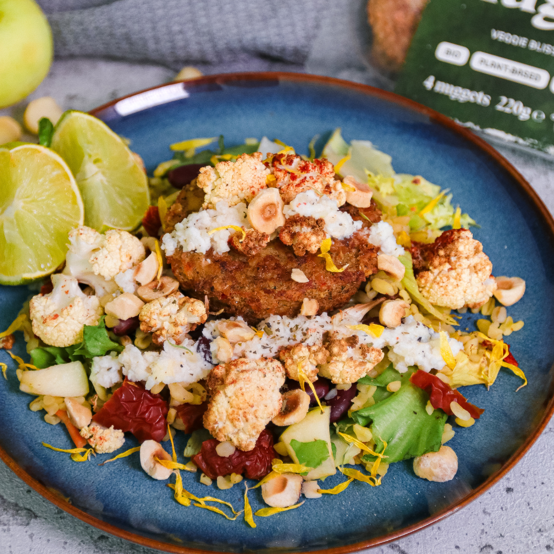 Rozehřejte troubu na 200 stupňů a mezitím si rozlámejte květák na kousky, které vyhovují baším preferencím. Ideálně však menší. Osoljte jej, opepřete a spolu s nugetkami pečte asi 15 minut do křupava s trochou oleje.